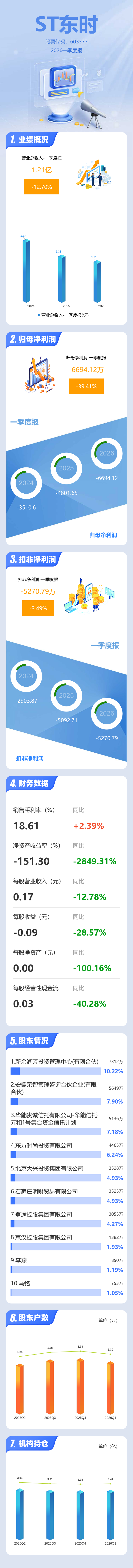 证券之星消息,ST东时2026年一季报显示,一季度公司主营收入1.21亿元,同比下降12.71%;归母净利润-6694.12万元,同比下降39.41%;扣非净利润-5270.79万元,同比下降3.5%;负债率90.77%,投资收益-11.22万元,财务费用1837.88万元,毛利率18.61%。