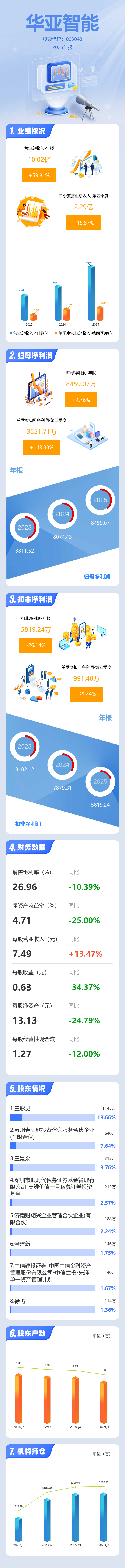 证券之星消息,华亚智能2025年年报显示,当年度公司主营收入10.02亿元,同比上升59.82%;归母净利润8459.07万元,同比上升4.76%;扣非净利润5819.24万元,同比下降26.15%;其中2025年第四季度,公司单季度主营收入2.29亿元,同比上升15.87%;单季度归母净利润3551.71万元,同比上升143.81%;单季度扣非净利润991.4万元,同比下降35.49%;负债率31.73%,投资收益101.27万元,财务费用766.26万元,毛利率26.96%。
