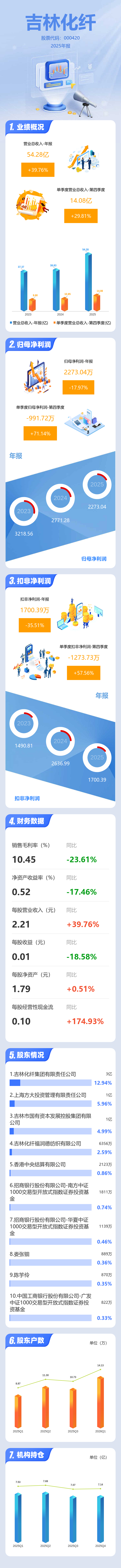 证券之星消息,吉林化纤2025年年报显示,当年度公司主营收入54.28亿元,同比上升39.77%;归母净利润2273.04万元,同比下降17.98%;扣非净利润1700.39万元,同比下降35.52%;其中2025年第四季度,公司单季度主营收入14.08亿元,同比上升29.82%;单季度归母净利润-991.72万元,同比上升71.15%;单季度扣非净利润-1273.73万元,同比上升57.57%;负债率63.98%,投资收益-581.09万元,财务费用2.75亿元,毛利率10.45%。