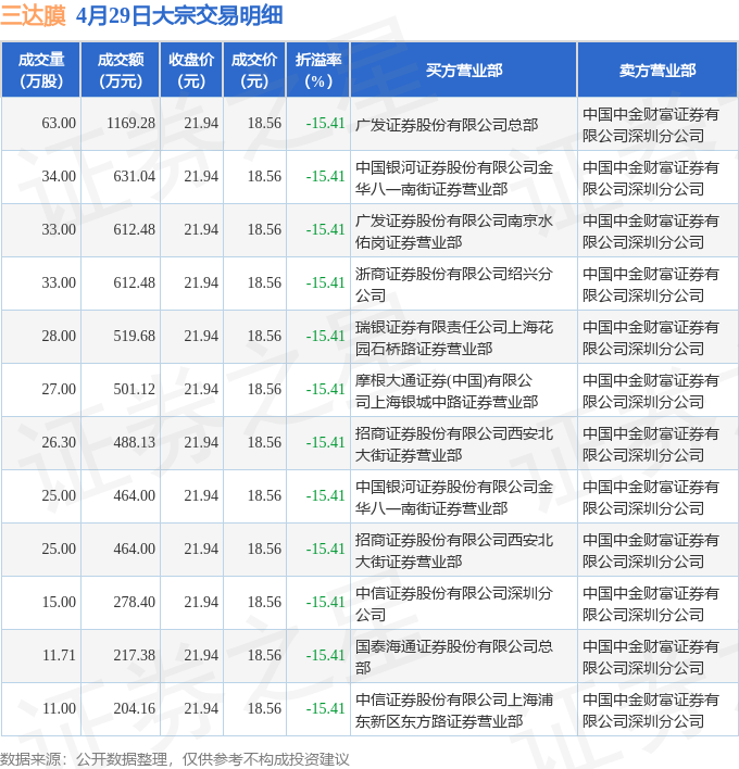 证券之星消息,4月29日三达膜发生大宗交易,交易数据如下: