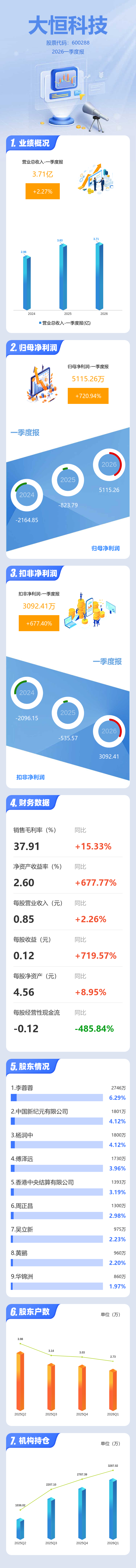 证券之星消息,大恒科技2026年一季报显示,一季度公司主营收入3.71亿元,同比上升2.27%;归母净利润5115.26万元,同比上升720.94%;扣非净利润3092.41万元,同比上升677.4%;负债率27.6%,投资收益4199.37万元,财务费用69.28万元,毛利率37.91%。