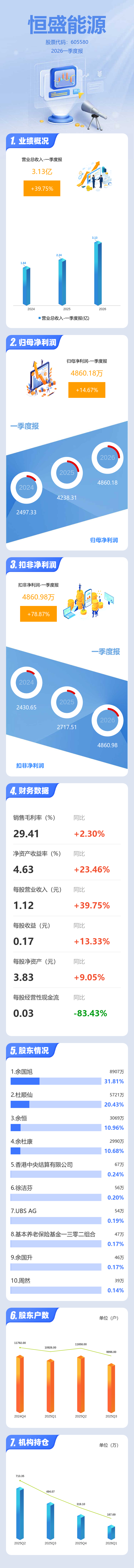 证券之星消息,恒盛能源2026年一季报显示,一季度公司主营收入3.13亿元,同比上升39.75%;归母净利润4860.18万元,同比上升14.67%;扣非净利润4860.98万元,同比上升78.88%;负债率45.29%,投资收益-3.78万元,财务费用378.67万元,毛利率29.41%。