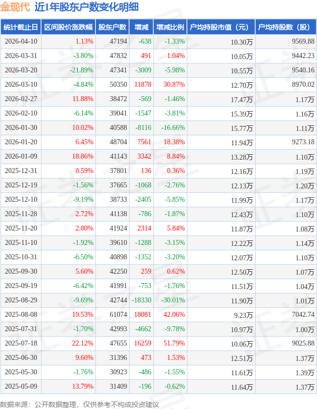 从股价来看,2026年3月31日至2026年4月10日,金现代区间涨幅为1.13%,在此期间股东户数减少638.0户,减幅为1.33%。