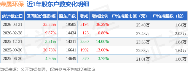 从股价来看,2025年12月31日至2026年3月31日,荣晟环保区间涨幅为25.35%,在此期间股东户数增加5194.0户,增幅为36.29%。