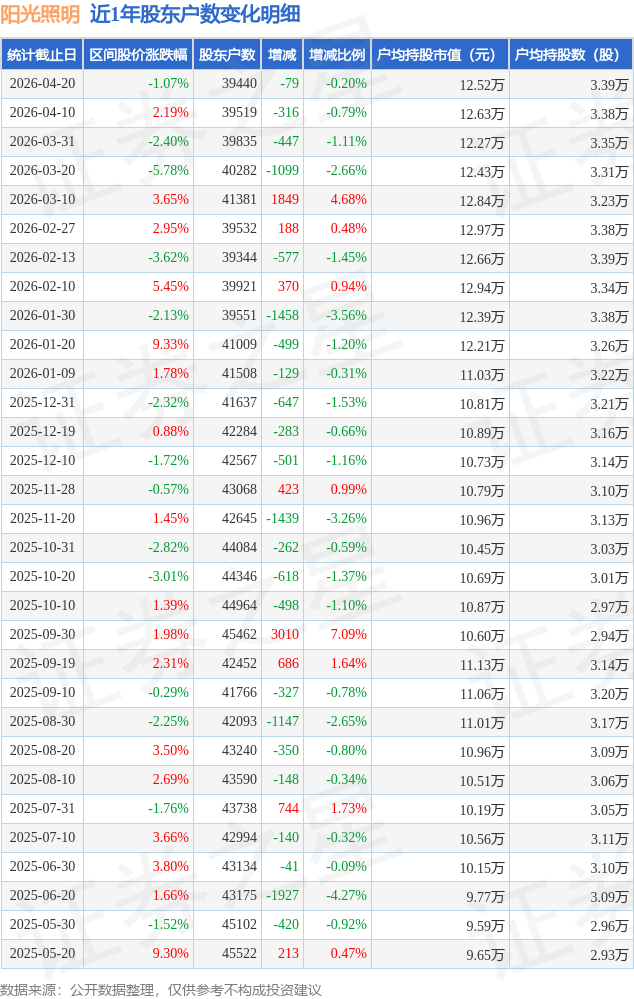 证券之星消息,近日阳光照明披露,截至2026年4月20日公司股东户数为3.94万户,较4月10日减少79.0户,减幅为0.2%。户均持股数量由上期的3.38万股增加至3.39万股,户均持股市值为12.52万元。