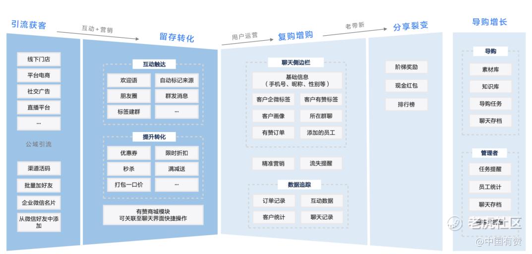 二是通过5大能力实现环环相扣的精细化运营。在企业微信已有的群聊、单聊、社交名片、客户标签等能力基础之上,有赞企业微信助手还将通过引流获客、留存转化、增购复购、分享裂变、导购增长等5大能力,帮助商家提高获客效果,加速成交转化,让企业微信“如虎添翼”。