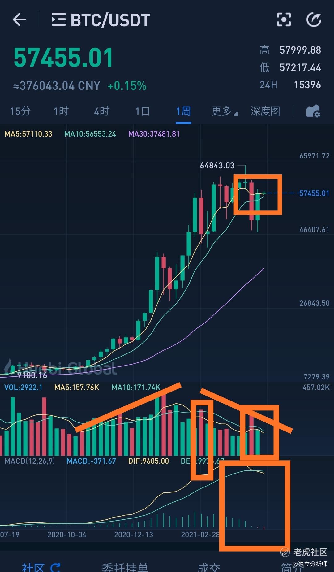 但现在情况不一样,还是看下图,目前的情况非常利于空头,而不可以多头:1.目前5周均线存在死叉10周均线的趋势。均线趋势存在明显的空头迹象。并且对k线构成压力位。2.周线成交量往往下跌周放量,而反弹周缩量,主力资金在下跌时大量出货,反弹缩量表明主力资金并不是在反弹时大量买入,而仅仅是借住反弹拉高出货空间。3.周macd已经死叉,并且macd的规律是:(1)多头的“绿柱”(红柱)缩短,则空头的“红柱”(绿柱)必出。(2)金叉后多头趋势时间长,死叉后空头趋势时间长。之前的周macd明显利于多头,逆市做空被拉爆也正常,但现在macd是利于空头。4.最关键的是周成交量趋势已经下降,与高位的价格k线形成明显背离。
