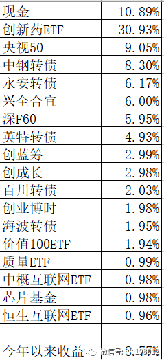 场内基金组合:实验基金切换轮动和可转债双低策略。本月把红利基金和价值基金,陆续换成了创新药指数基金,并且取得了比较好的业绩。可转债双低的策略,选择折价高的,价格又比较低的,不断循环轮动。