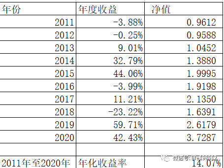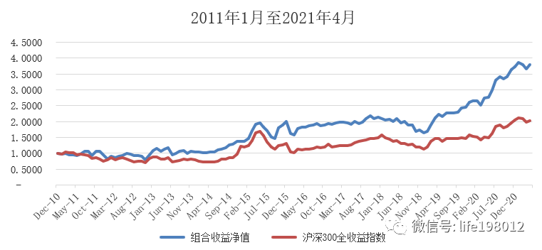 2021年以来的实际组合包括场内组合、场外基金组合和港美组合的整体收益是2%。2011年至2021年4月份净值从1元至3.7919元。年化收益率是13.8%。