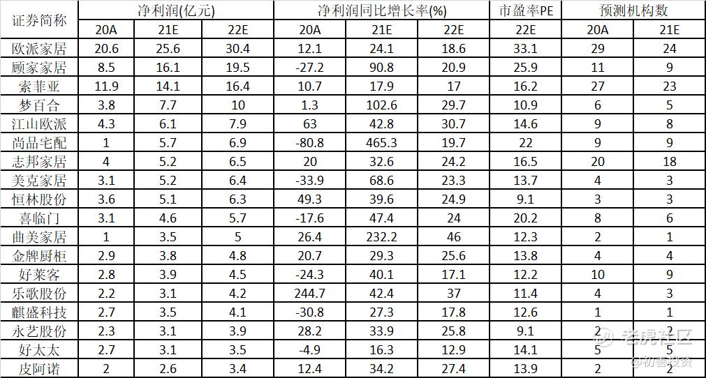 券商的研报可以作为一个参考,但是整体参考性不强,这根本的原因是预测的难度太大了。下图是家居板块上市公司的券商预期,可以看到,所有的预测都是20%以上甚至更高的净利润增长率,这显然不可能,同时有些公司只有三五家券商覆盖,参考意义就更小了。