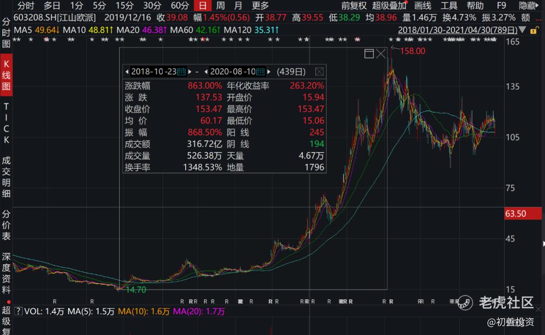 乐歌股份我们文章开头说过。再看江山欧派,作为木门龙头企业,受益于大宗业务的爆发,净利润从2017年的1.4亿增长至2020年4.3亿,江山欧派的股价在2018年底到2020年中,有过一波最大涨幅超过10倍的涨幅。