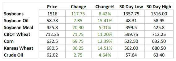 谷物和油籽市场出现了一段时间以来最强劲的反弹。这是由于种植地区的天气不断恶化,并建立了可观的供需平衡表的基本结构。
