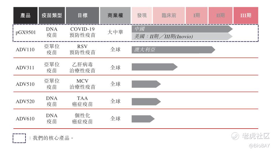 核心产品pGX9501(INO-4800)是艾棣维欣与美国Inovio制药联合开发的一款新冠DNA疫苗,也是中国首个也是唯一一个处于临床阶段基于DNA的新冠候选疫苗。该疫苗于2020年12月启动2期临床试验,预计在今年第二季度启动3期试验,并在年内完成所有临床试验,有望在今年下半年向国家药品监督管理局(CDE)提交上市申请。(相关阅读:B村临床丨艾棣维欣全球首个新冠DNA疫苗启动III期临床,有望年底上市)