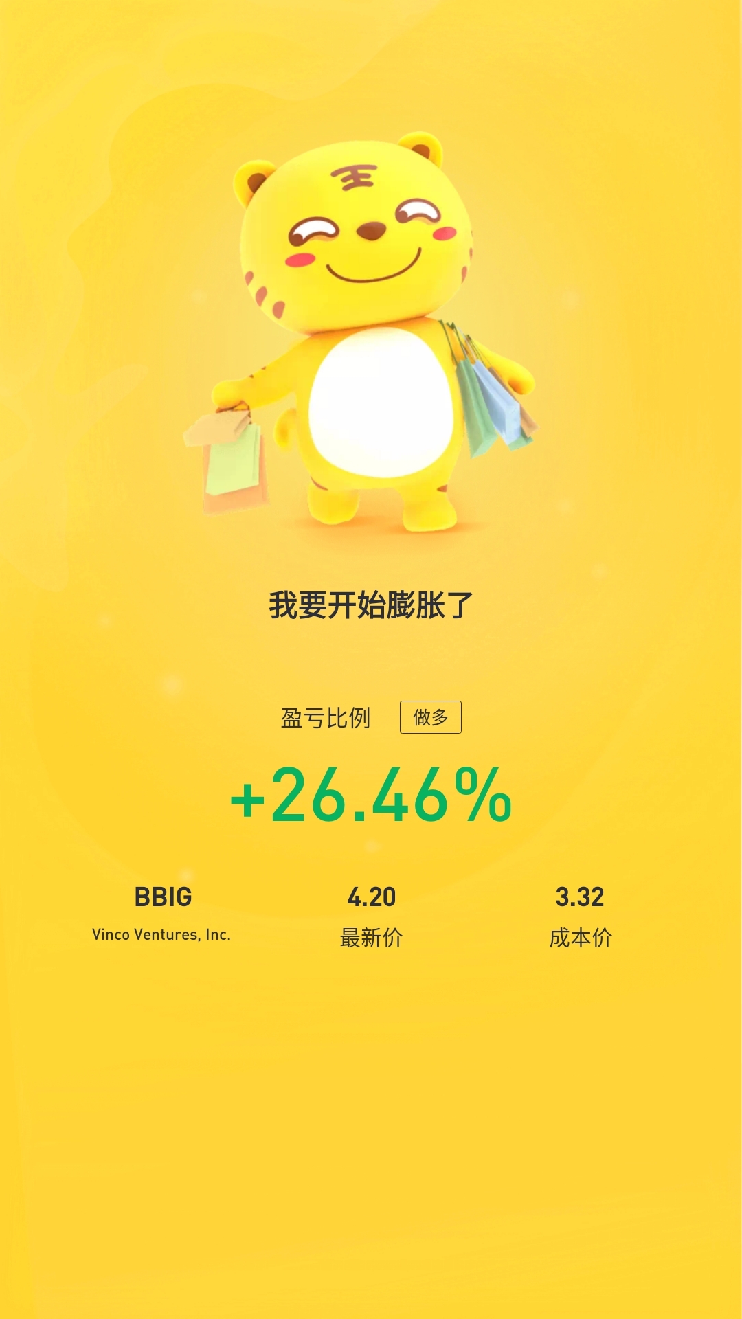 $Vinco Ventures, Inc.(BBIG)$前阵子3.60建仓,一路掉到2.80 , 但是稳住心态,3.00再次加仓,今天看到了小小回报, 昨天虽然一路飞到5.24然后极速下降,但是4.20我到时会再加仓,小腾讯正在谈合并了,合并后不敢说飞天,但是稳在8.00这是对于合并后BBIG来说小菜一碟