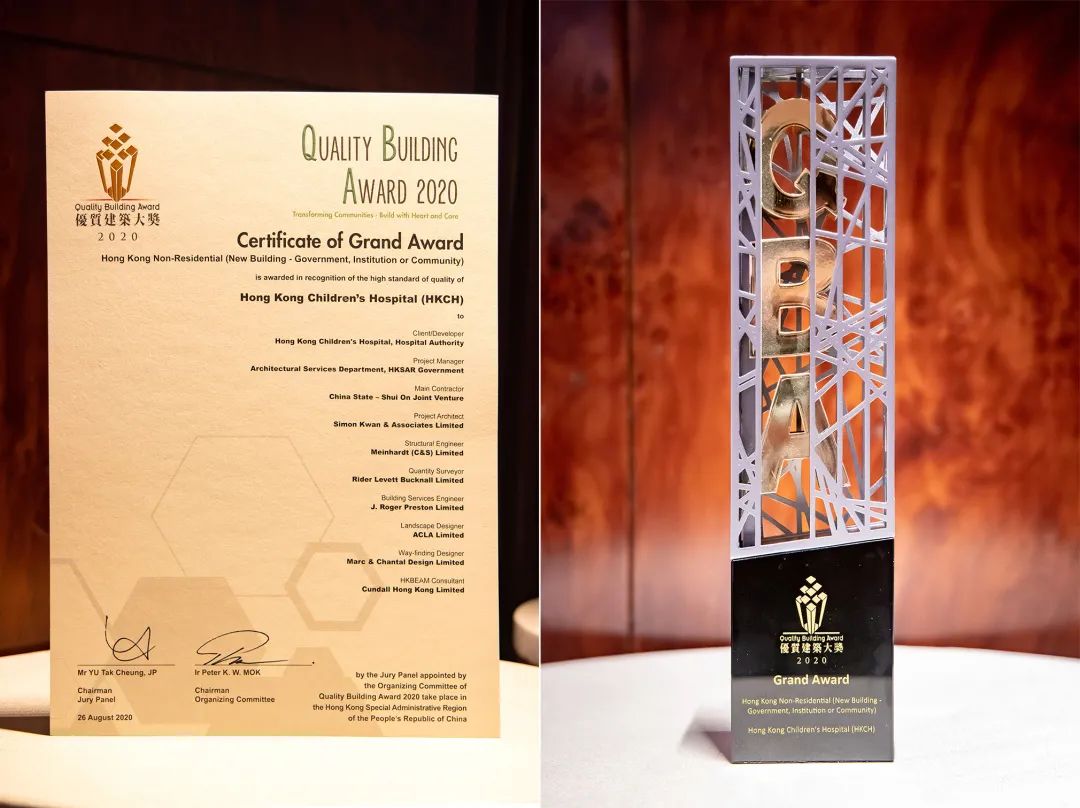 香港兒童醫院項目憑借精湛的設計及優異的建築質量,在5個入圍項目中脫穎而出,榮獲“香港非住宅項目(新建築物–政府,機構或社區)”類別優質建築大獎。中國建築國際助理總裁黃江與業主代表建築署署長何永賢,顧問公司代表以及項目團隊成員共同上台領獎。