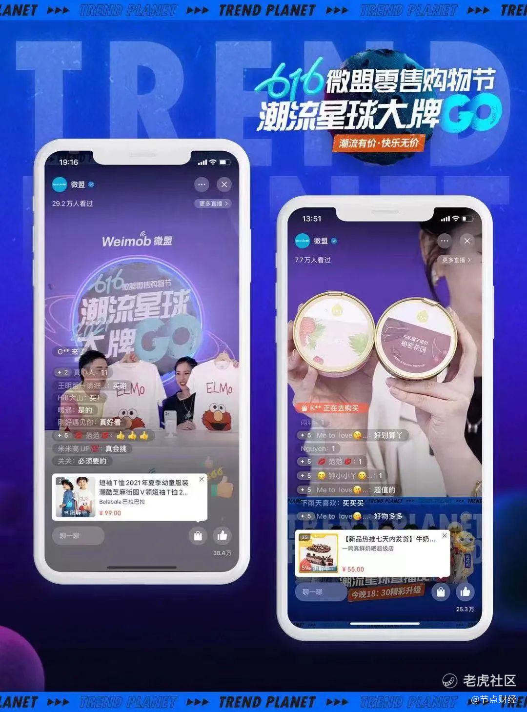 第二届微盟 616,首先在投入资源和表现形式上更多样,形成了 " 主直播间 + 百家品牌视频号直播、快闪店 + 万家门店、小程序主会场 + 众多分会场 " 的线上线下联动模式。