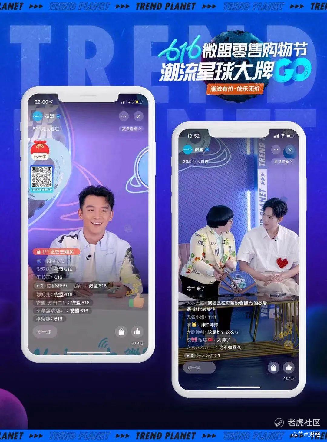 其次,在直播形式上,李晨Nic、王以太、郑恺、丁泽仁、李大奔、冉高鸣等“潮人”在微盟616的直播间里开启了一场集 " 圈内潮人Battle"、"Rapper+ 带货 "的模式,明显比一些平台“歇斯底里”的传统带货吸引眼球。