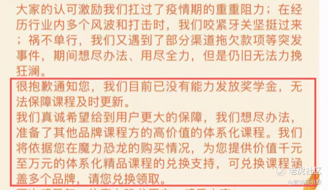 此外,直接拖欠和失联的机构也存在,而疫情成了最好用的“背锅”对象。课程方可能会直接贴出通告称:“公司受到了疫情的影响,已经没有能力发放奖学金”;“虽然扛过了疫情,但又遇到了突发事件,无法力挽狂澜”;“受疫情影响人力不足、系统奔溃,要重新进行打卡统计”……
