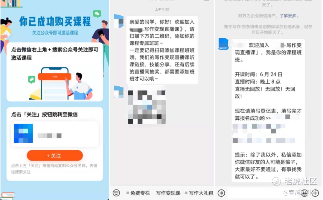 体验几天后,你会被引导至付费购买高价课这个最终“被收割”的环节。拉你入群的那位顾问会在此时打鸡血一般推销课程,并告诉你此时是优惠价格,机不可失。同时微信群里可能还会安排几位扮作已购买课程的学员,进一步刺激那些还没付钱的人尽快下单。