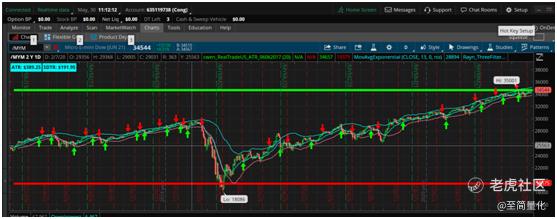 我们将回测后的策略加以改进,引入ATR判断止盈止损点,制作成了指标,效果见下图。绿色向上的箭头为买点,红色向下的箭头为卖点,直观看效果不错。感兴趣的读者可以直接下载,加载到Thinkorswim平台作为交易参考。