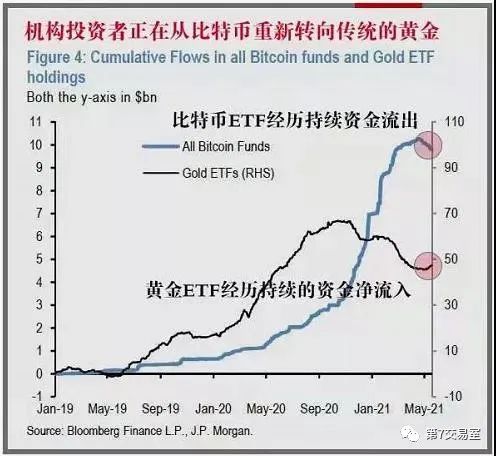 上周当数字货币出现暴跌的时候,就有大量的热钱从比特币流出而流进了黄金ETF里。