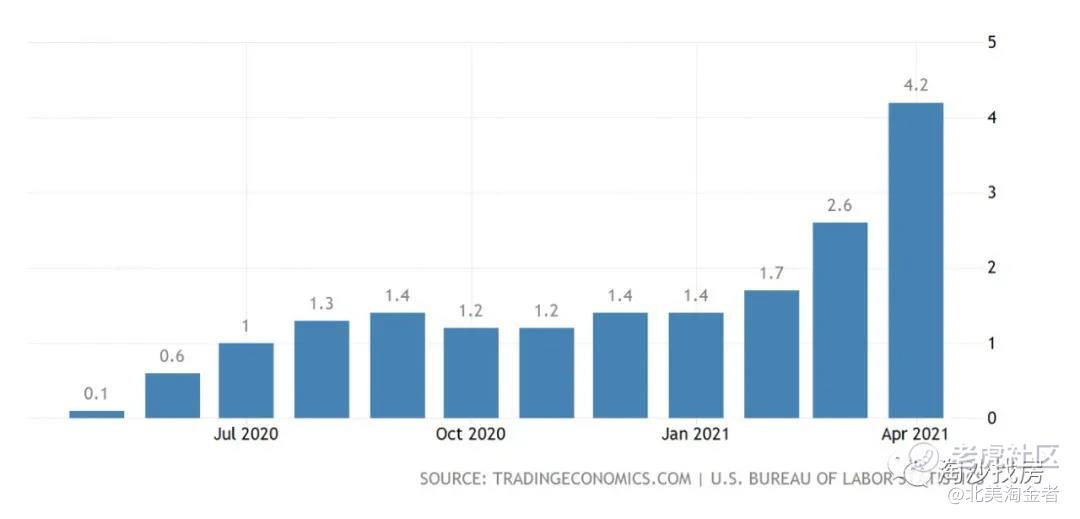 今天的文章来自北美地产学堂淘沙找房CEO Michael,用数据分析美国楼市的现状和未来。3月份通胀率还只有1.8%-2.4%,4月份,一夜之间2.6%跳到了4.2%,远超预期的3.6%,是自2008年9月以来,13年最高!从2021年3月到4月,一个月就跳了0.8%,也是创下自2009年以来月增长纪录!
