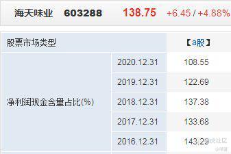 可以看出海天味业的净利润现金比率很高,近五年都大于100%的。说明海天的销售回款能力及盈利能非常强,利润质量高。