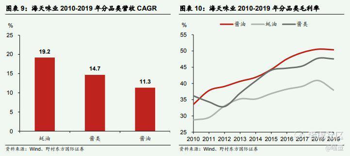 受益于蚝油行业快速增长,公司蚝油品类营业收入增速最高(2010-2019 年 CAGR:19.2%),其次为调味酱,而酱油品类由于较为成熟且基数较高,增速相对平稳,2010-2019 年 CAGR 为 11.3%。