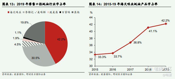 蚝油方面,公司在零售端的优势显著,市占率稳步提升。得益于公司在蚝 油领域的耕耘,公司蚝油产品的市占率提升速度较快。按零售口径,2015 年公 司蚝油市占率为 33.3%,2019 年提升 8.9 个百分点至 42.2%。2019 年公司蚝 油产品市占率超过第二名的李锦记(30.5%)11.7 个百分点。