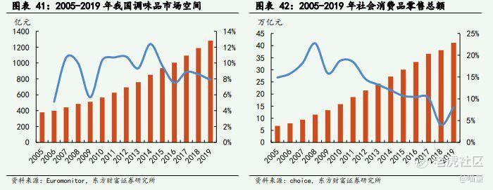 我国调味行业空间广阔,高速增长有望持续。根据 Euromonitor,2005-2019 年我国调 味品行业市场空间由 379 亿元上升至 1282 亿元,CAGR+9.09%。2016 年后,我 国调味品市场空间增速维持在 8%左右。