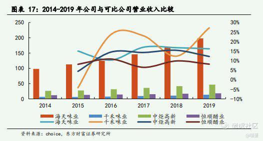 营收水平较高,增速高位稳定。与同行业可比公司相比,公司的营收水平较 高,2019 年,公司实现营收 198 亿元,是千禾味业/中炬高新/恒顺醋业的 14.61/4.23/10.81 倍。公司营收增速较稳定,2017 年至今维持在 17%左右,高于 中炬高新和恒顺醋业,千禾味业营收增速波动较大。