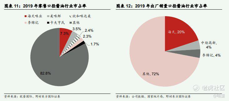 公司的酱油和蚝油产品是行业的绝对龙头。酱油方面,按零售口径,2019 年海天味业市占率为 7.3%,超出第二名的美味鲜(3.5%)3.8 个百分点。若按 出厂销量口径,海天味业的领先优势更加明显。2019 年海天 味业酱油销量占全行业销量的 19.9%,远超第二位的中炬高新(即美味鲜) (4.1%)。