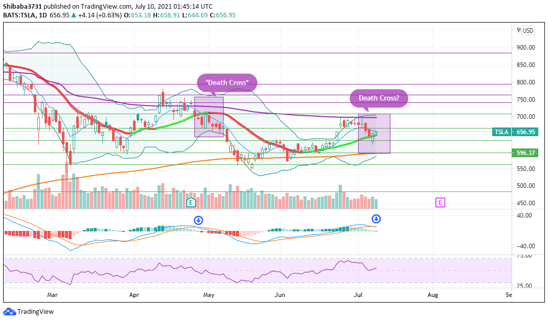 $TSLA has failed to break VWAP (purple line) around the $700 level since last week of June and has been on a downtrend since then. Similar to May's "death cross", it's 8EMA is about to cross 21EMA which means it is likely to go down. MACD also showing similar convergence downwards. Unless something positive comes out next week, TSLA could be on a downtrend. However this time round, watch out for the 200EMA (orange line) for a possible rebound. If you are looking to buy dips, wait for the $596-600 level for good bargain. *This is just my personal opinion* Cheers!