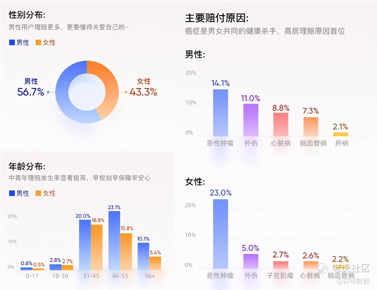 水滴保理赔服务半年报中显示,水滴男性用户理赔概率占比为56.7%,高于女性。年龄在31-55岁的中青年理赔发生概率显著提高,这部分群体占理赔用户总量的77.7%。男性理赔用户高发疾病Top5分别为恶性肿瘤、外伤、心脏病、脑血管病、肝病,女性理赔用户高发疾病Top5为恶性肿瘤、外伤、子宫肌瘤、心脏病、脑血管病。