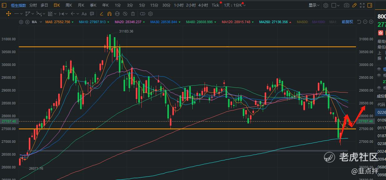 恒指目前来说,后市回调,只要不跌破27500点,那么这里完全有机会企稳向上 ,虽然说短期图形上是难看了一点,但是从整体宏观经济结合各方面来看,我还是看好市场的~