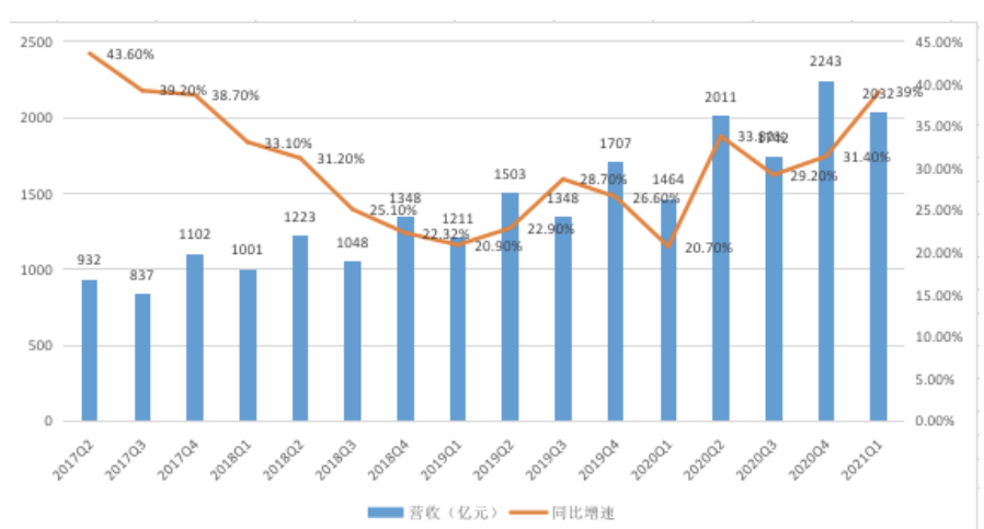 2020年,京东年营收首次突破千亿美金。今年一季度,京东延续去年的向上势头,营收再次突破2000亿元,增幅达三年内新高。