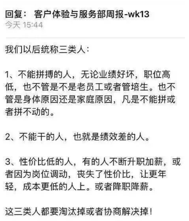 2019年,京东流出的内部邮件显示,东哥要求要淘汰掉或协商解决掉「三类人」。