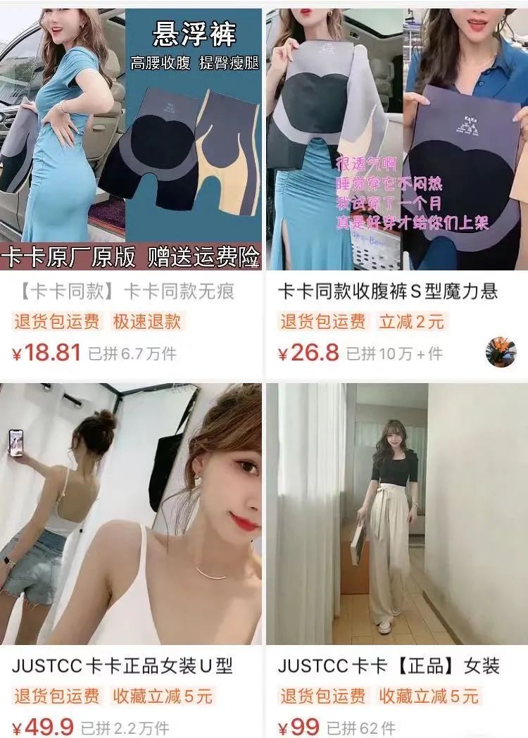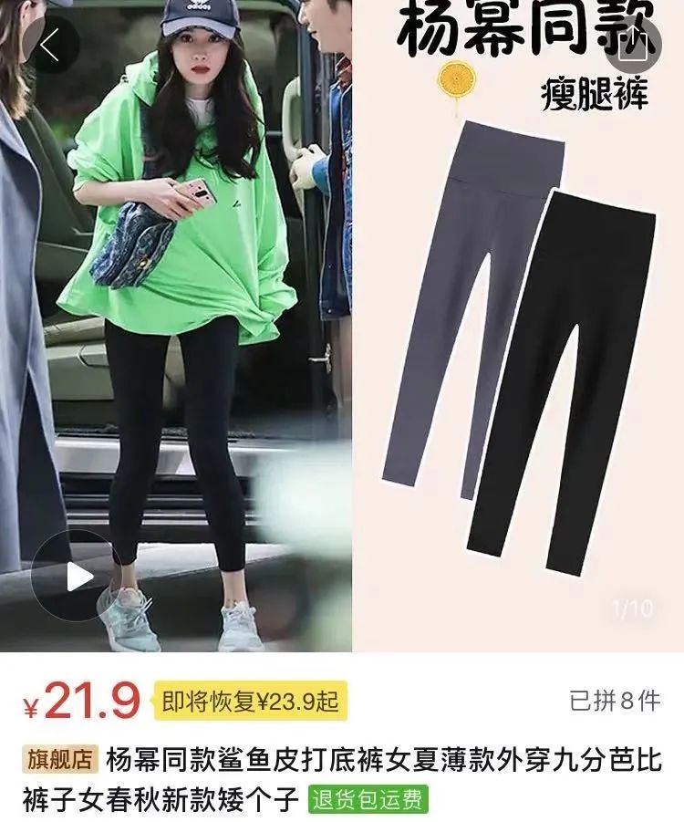 博主推荐的明星穿搭照片里,杨幂穿的其实是lululemon,而他们实际下单的品牌却名不见经传,这又有什么要紧呢?县城翠花甚至比一线Jessica更早掌握了这种穿搭风格,因为瑜伽裤在直播间里的折扣价只要5块钱。