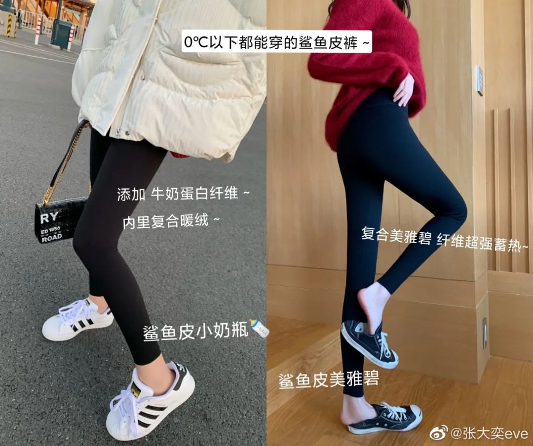 最著名的鲨鱼裤是带货网红张大奕首先推出的。它可能是借鉴了鲨鱼皮泳衣的灵感,意在体现穿上之后双腿能获得鲨鱼一样的流线感。