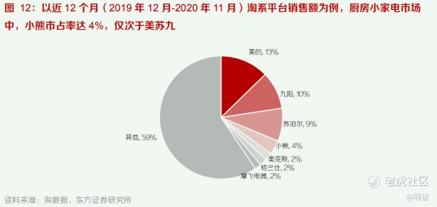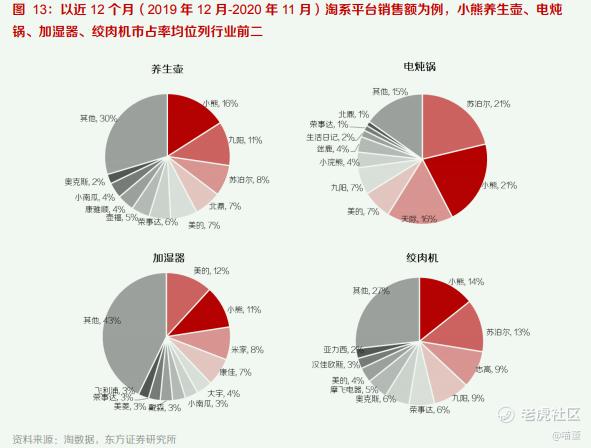 公司在厨房小家电市场中市占率仅次于“美苏九”,其中养生壶、电炖锅、加湿器、绞肉机等收入 贡献占比较高的优势品类市占率排名均位于行业前两位。以淘数据统计的近 12 个月(2019 年 12 月-2020 年 11 月)淘系平台销售额数据为例,厨房小家电市场中,小熊品牌市占率达 4%,位居行业第四,仅次于美的、苏泊尔、九阳等传统小家电龙头企业;