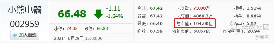 目前小熊电器的总市值为104亿。