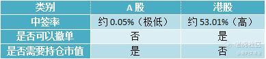 怎么去体会港股中签率的水平呢?如果拿港股和A股作对比,就可以体现出港股中签率之高了,下面是最近的一个数据: