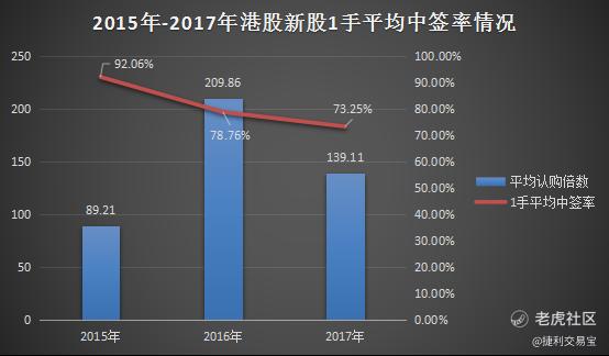 可以看出差距还是很明显的,并且,A股打新往往需要几十万,中签率还十分低,而港股打新只需要几千,1手的中签率还高达53%左右,同样来看2015年-2017年的港股新股1手中签率
