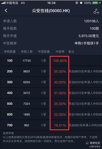 为什么港股中签率远高于A股?因为港股分配机制是偏向散户的,申购资金越大,一手中签率越低。看起来好像相当矛盾,需要举个栗子。比如大热门三马概念股——众安在线(6060.HK),只申购1手,中签率是100%;申购2手,中签率是55%,就是说在100%中1手的前提下,中第二手的概率是10%,即2*55%=110%;申购5手的中签率是25.5%,5*25.5%=127.5%,有27.5%的概率中第二手;申购80手的中签率是2.4%,80*2.7%=216%,有16%的可能中第三手。如下图: