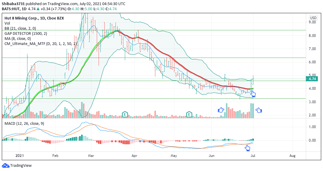 $HUT is "screaming" that it's on the verge of breaking out with downside capped at $3.20 and upside easily $6 - 8 from here. Good to consider some Oct $5 calls or even holding it for the long term. *Just my personal opinion. Not financial advice* Cheers!