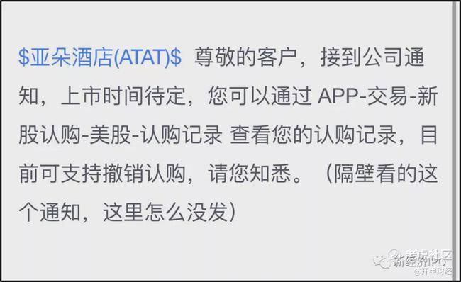 6月30日上午,很多投资人收到券商发送短信,“尊敬的客户,接到公司通知,亚朵集团(ATAT)上市时间待定,您可以通过APP-交易-新股认购-美股-认购记录,查看您的认购记录,目前可支持撤销认购,请您知悉。”