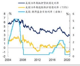 除了央行“放水”,美国的低利率也影响着房价的增长。去年疫情开始后,美联储先后采用降息和QE来应对经济的下行,导致美国长端利率明显下降,30年房贷利率曾一度触及2.65%历史低位,近期一直都徘徊在3%左右,大幅降低了贷款买房的成本,刺激了居民贷款购房的意愿。