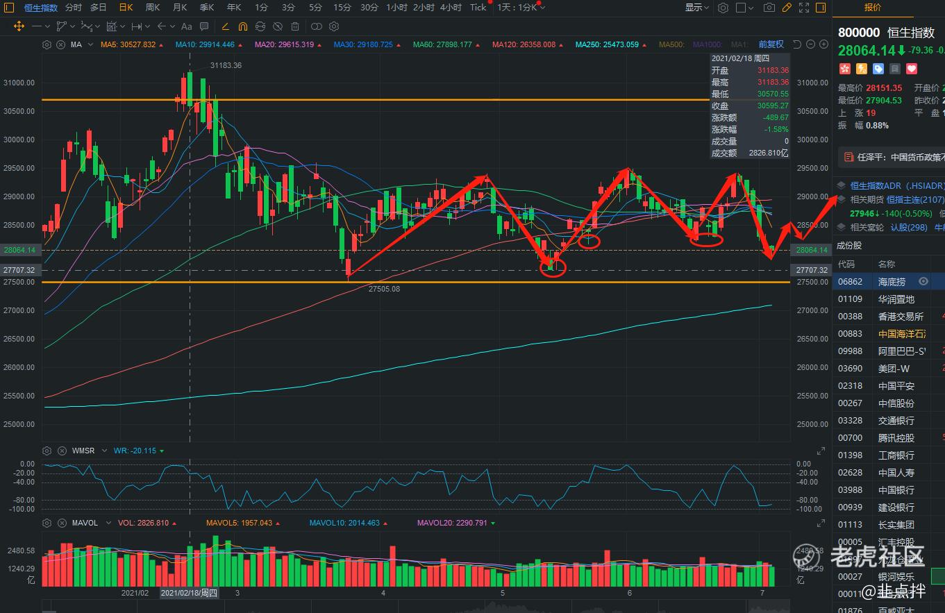 恒指前面跌破了28170点支撑,第二支撑点可以看27707点,属于箱体中枢,这位置的支撑是前期启动的支撑点,是属于比较强的,这位置后续我估计会震荡,但是整体来说向上趋势还未反转,依旧可以看好~