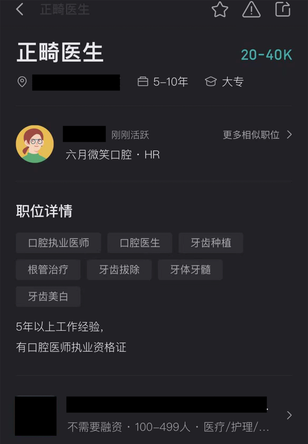 在招聘网站上,一些正畸医生招聘条件仅要求“五年工作经验”和“口腔医师执业资格证”。