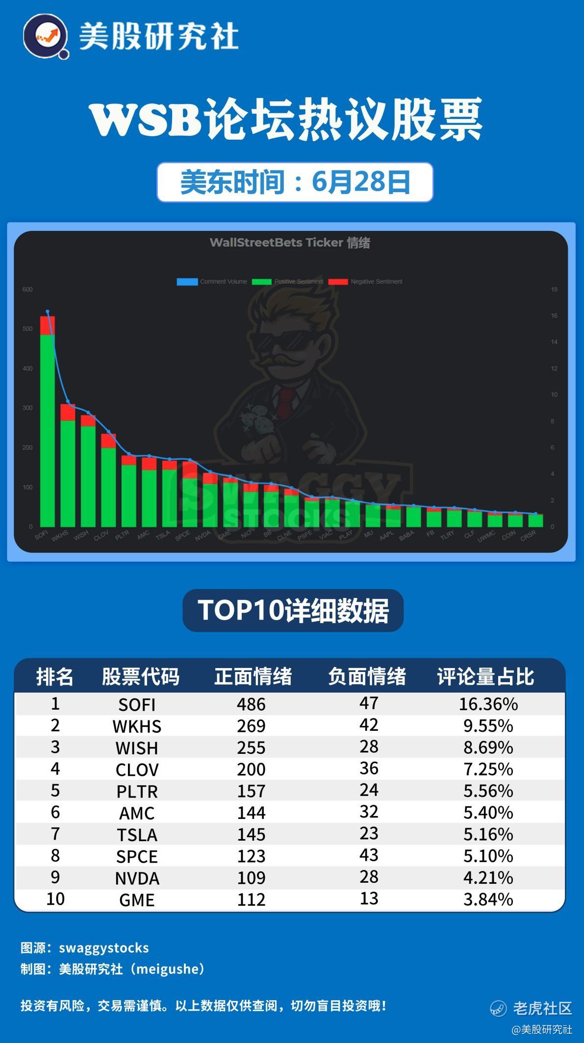 美东时间6月28日,WSB论坛热议股票top10分别是:SOFI、WKHS、WISH、CLOV、PLTR、AMC、TSLA、SPCE、NVDA、GME。